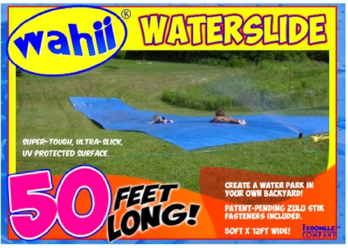 Create a waterpark in your own backyard with the Wahii WaterSlide! It's 50ft long and 12ft wide! Ideal for birthday parties, church picnics, or simply for creating childhood memories that will last a lifetime. Initial set-up takes approximately 15 minutes... the slide is huge! No hose hook-up to the slide. The Wahii is constructed of thick specially formulated, UV protected plastic. Surface is extremely smooth and rated to hold 256lb per square foot. Tough and durable so it will last for years. Patent-pending Zulu-Stik Fasteners hold the slide to the grass. The Original Wahii WaterSlide, since 2007. Read more...